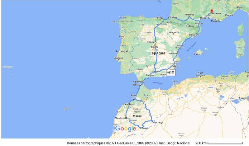 Le parcours d'environ 6000 km, traverse la France, l'Espagne et le Maroc. Le village départ a lieu à Biarritz, puis les équipages traversent librement l'Espagne jusqu'à Algésiras et prennent le ferry pour le Maroc, où les épreuves du raid commencent.